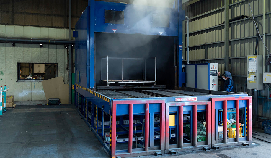 後工程の塗装を鉄表面に定着させ長持ちさせるために、油や汚れを落とします。洗浄機でお湯による高圧洗浄を行い、隅々まで洗い上げています。