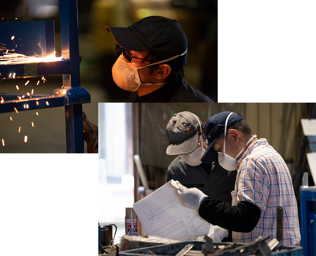 設計図を元に、図面に正確な製品を作り上げます。溶接部門は、半自動溶接・溶接組み立てを行います。塗装部門では、洗浄と吹付け塗装を行います。